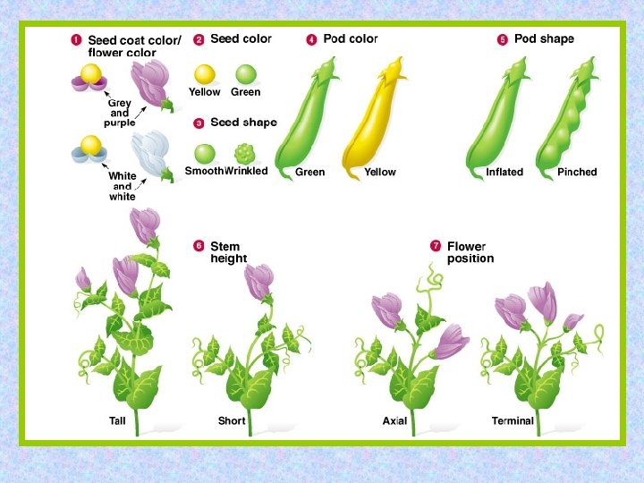 Mendel’s Experiments • • Mendel cross-pollinated pea plants Focused his work on 7 different traits seed color: seed shape: pod color: pod shape: stem height: flower position: flower/seed coat color: yellow vs. green smooth vs. wrinkled green vs. yellow inflated vs. pinched tall vs. short axial vs. terminal purple vs. white flowers grey vs. white seed coats Counted the offspring of each phenotype and analyzed the results mathematically