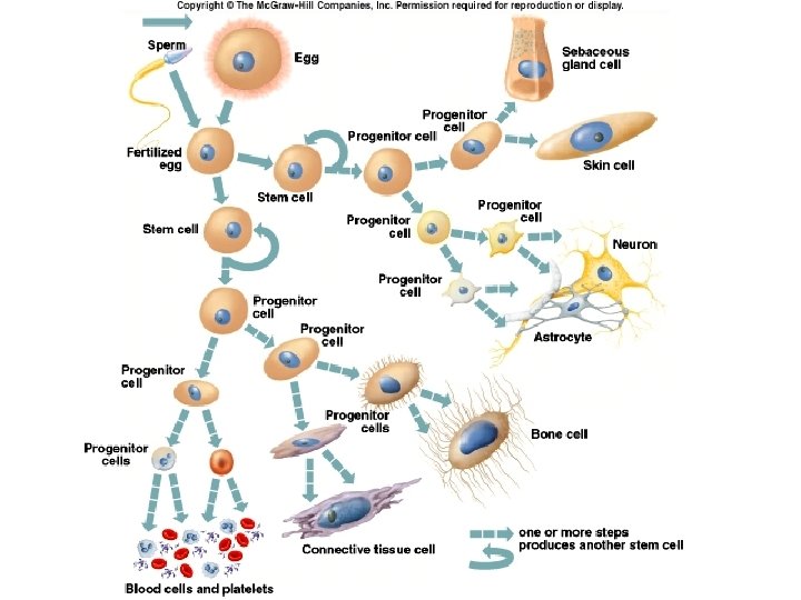 Cell Differentiation 1. New cells from mitosis develop into different types of cells with specialized functions Stem cell • can divide to form two new stem cells • can divide to form a stem cell and a progenitor cell • totipotent – can give rise to any cell type • pluripotent – can give rise to a restricted number of cell types Progenitor cell • committed cell • can divide to become any of a restricted number of cells • pluripotent