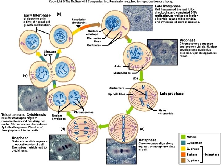 Eukaryotic Cell Cycle -Stages 1. Interphase (3 parts) – cell spends most of time growing and protein synthesis 2. G 1 Phase – Growth 1 - Cell grows does “daily activities” 3. S Phase – Synthesis -DNA is copied 4. G 2 Phase – Growth 2 - Organelles are copied 5. M Phase – Mitosis - Chromosomes are separated into the 2 ends of the cell, each pole will become a new cell that is exactly the same as the old 6. C Phase – Cytokinesis – Cytoplasm divides and 2 identical daughter cells are formed