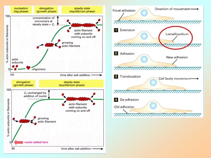 • External signals must dictate the direction of cell migration. • Cell migration is initiated by the formation of large membrane protrusion. • Video microscopy showed that G-actin polymerizes to F-actin. (Drugs can alter this process). • Actin exists as a globular monomer (G-actin) and; A filamentous polymer (F-actin) protein. • The addition of Mg 2+, K+ or Na+ to a solution of Gactin induces the formation of F-actin and this process is reversible. • Elastic mechanical property of actin filament.