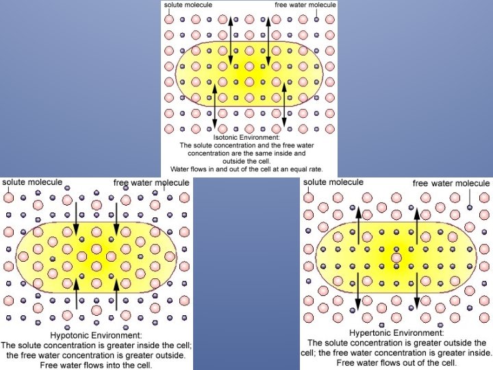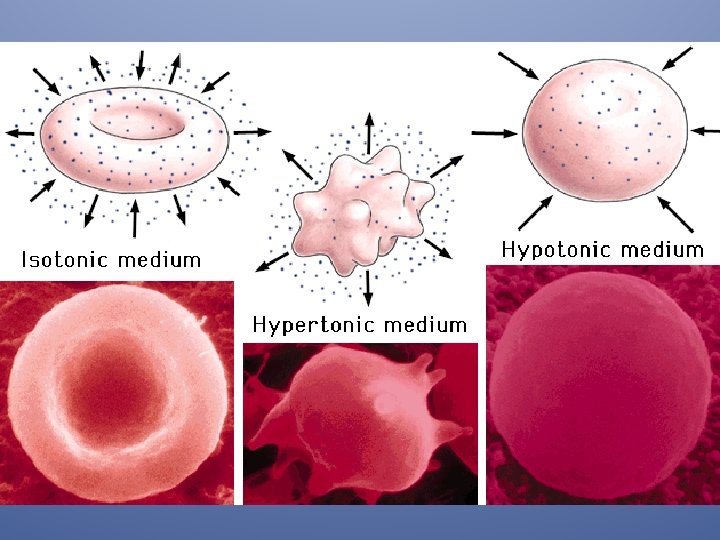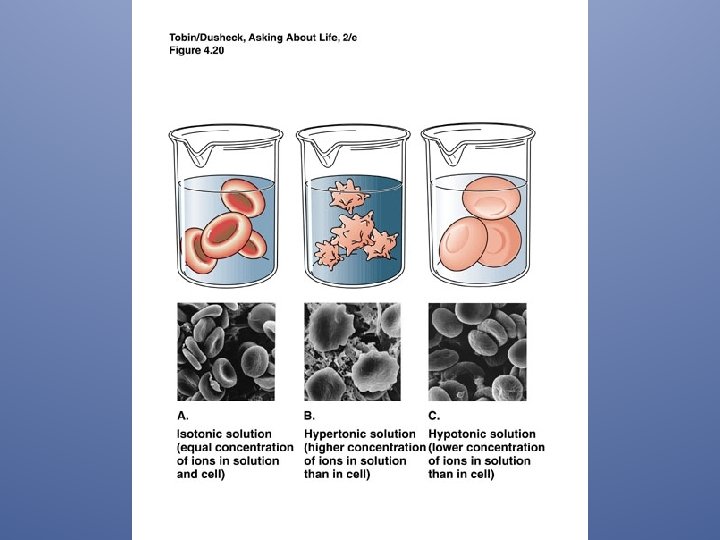 3 types of Osmotic Solutions: P. 186, fig. 7 -16 u Isotonic – Concentrations are equal on both sides of the membrane. – Normal looking cells u Hypertonic – Solution outside the cell has a higher solute concentration than the inside of the cell. – Water leaves the cell. – Cells shrink u Hypotonic – Solution has a lower solute concentration than the cell. – Water enters the cell. – Cells swell