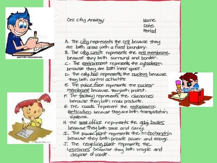 Explain why you chose the items to represent each cell part • List the letters A-J • For each letter: – State the name of the place/character – The name of the cell part it corresponds to – Why you selected that item to represent the cell part • Must be in complete sentences. – Example: D: The city hall/courthouse represents the nucleus because its function is to control the town’s activities On notebook paper.