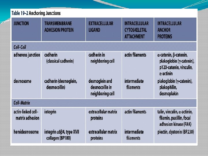 Adhering Junctions �Desmosome- Connects intermediate filament of one cell with other cells. �Claudin �Hemidesmosome �Desmoplakin is essential for normal desmosomal adhesion.