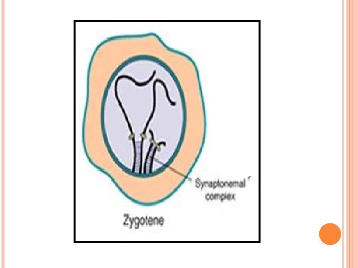 Zygotene: �The Zygotene or zygonema, means "paired threads. “ �The synapsis (pairing/coming together) of homologous chromosomes takes place. �Chromosome synapsis is followed by the formation of complex structure called synaptonemal complex. �Pair of synapsed homologous chromosomes is called a bivalent or a tetrad.