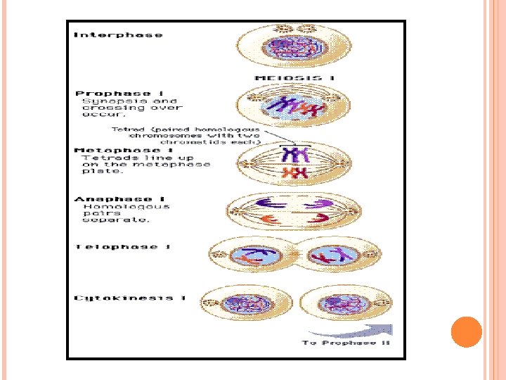 MEIOSIS: REDUCTIONAL DIVISION �Occurs in germ cells to form gametes in sexually reproducing organisms. �Many stages of meiosis are similar to mitosis. �It includes meiosis I and meiosis II �The essential stages during meiosis are: a) two successive divisions without any DNA replication occurring between them, b) formation of chiasmata and crossing over, c)segregation of homologous chromosomes, d) Separation of sister chromatids.