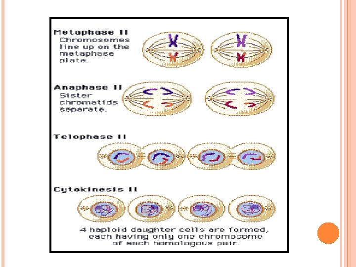 Meiosis II: �Similar to mitosis. �Production of four haploid cells �The four main steps: Prophase II, Metaphase II, Anaphase II, and Telophase II.