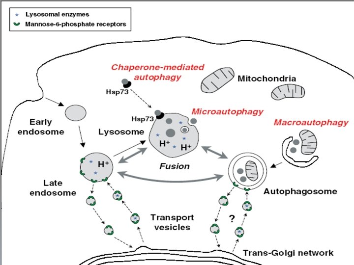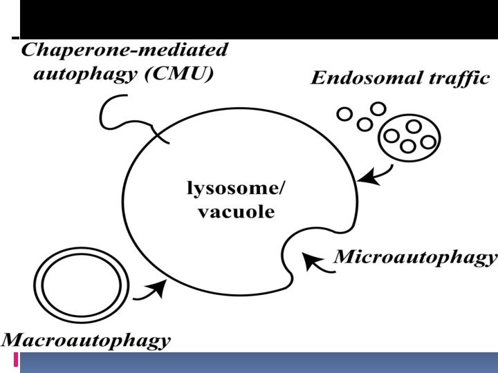 Autophagy: cellular selfcatabolic process "eating oneself” There are several different classifications in Autophagy Macroautophagy - sequestration of cytoplasmic substrates including organelles Microautophagy - lysosomal invagination and ingestion of minor portions of the cytosol Chaperone-mediated Autophagy - involves recognition of specific substrates by Hsc 70 (heat shock cognate 70) machinery to remove abnormal cytoplasmic organelles and other components