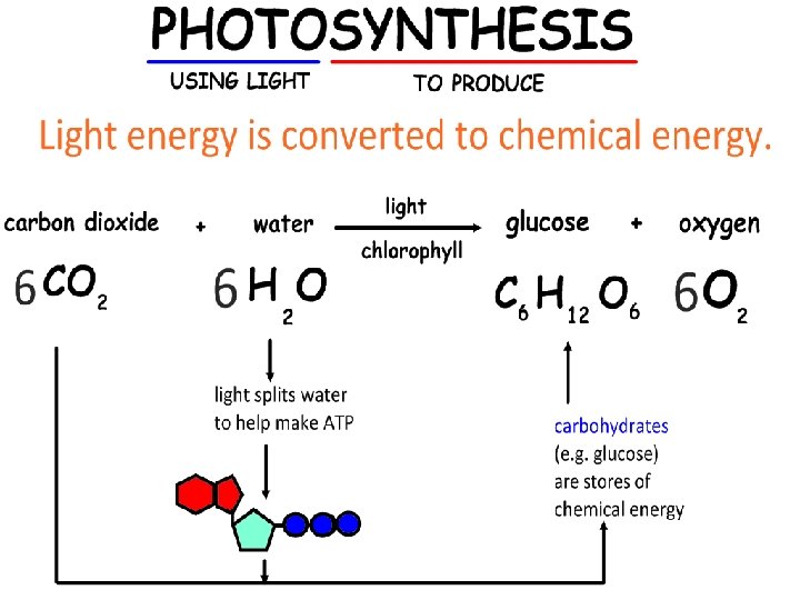 § Plants use the energy captured by chlorophyll to change to carbon dioxide and water into food. § The food is then changed into glucose. ( sugar) The glucose is stored in the plant. § Photosynthesis produces oxygen.