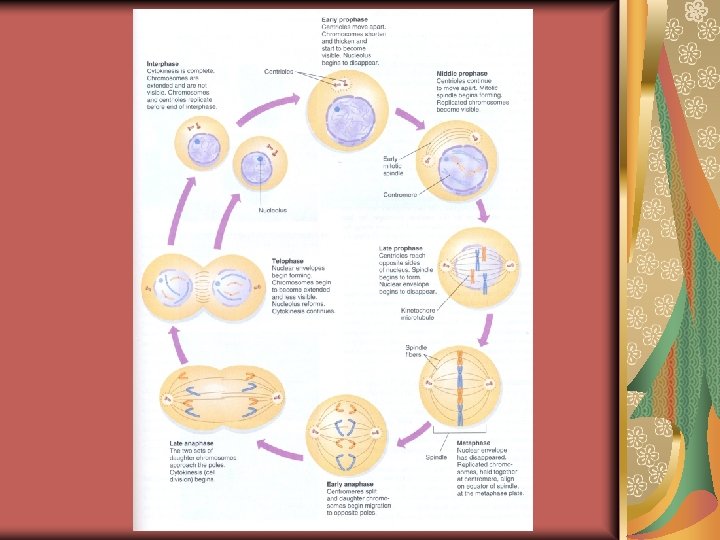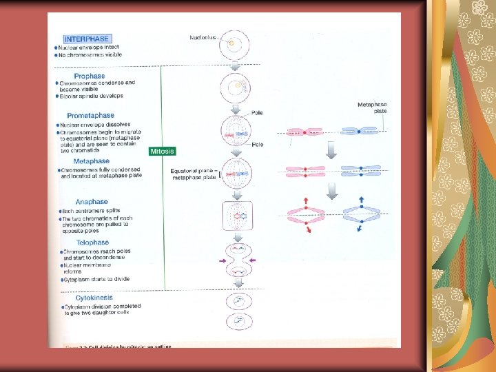 The stages of Mitosis Prophase: the chromatides are very elongated and they begin to coil tightly. So they appear shorter and fatter under the microscope. Metaphase: the nuclear envelope has completely disappeared. The microtubules attached to the kinetochores orient the chromosomes so that their centromeres become aligned in one plane halfway between the two spindle poles. Anaphase: It begins when the joined centromeres of sister chromatids separate, giving rise to two daughter chromosomes. Telophase: During this stage the migration of daughter chromosomes to the two poles is completed.