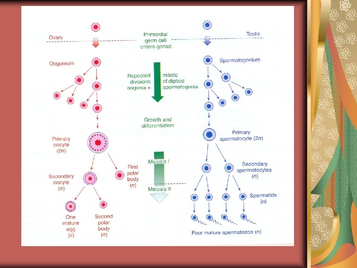 Ø In males, meiosis’ product is four spermatozoa; in females, however, there is asymmetric cell division because the cytoplasm divides unequally at each stage: the products of meiosis I (the first meiotic division) are a large secondary oocyte and a small cell (polar body). Ø During meiosis II (the second meiotic division) the secondary oocyte then give rise to the large mature egg cell and a second polar body.