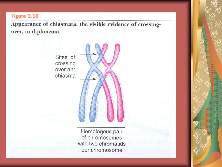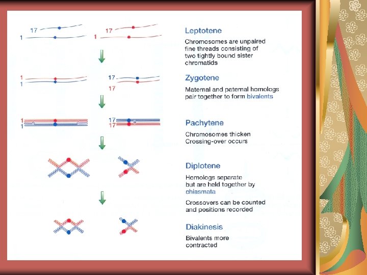 Meiosis’ stages 2 3. Pachynema: (midprophase I, the pachytene stage); starts when synapsis is completed and each synapsed set of homologous chromosomes consists of 4 chromatids which called a bivalent or a tetrad. § Crossing-over is a significant event for genetic which the reciprocal physical exchange of chromosome segments at corresponding positions along pairs of homologous chromosomes occurs. § This exchange is facilitated by the alignment of the homologous chromosomes brought about by the synaptonemal complex. § If there are genetic differences between the homologs, crossing-over can produce new gene combinations in a chromatid (The new chromosomes called recombinant chromosome).