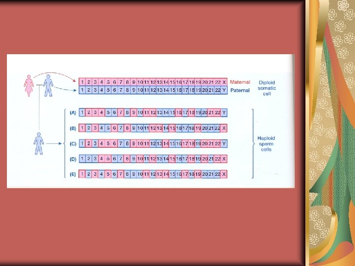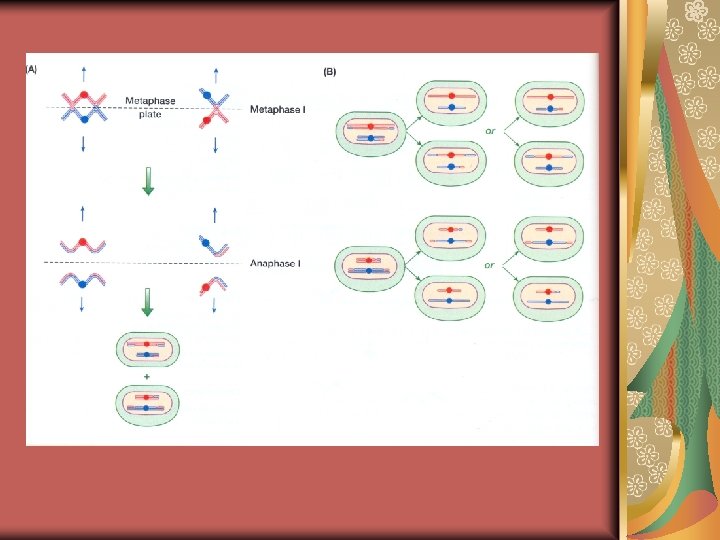 Gene segregation in Meiosis has three significant results: 1. Meiosis generates haploid cells which fusion of haploid nuclei restores the diploid number. 2. In metaphase I, each maternally derived chromosome and each paternally derived chromosome has an equal chance of aligning on one or the other side of the equatorial metaphase plate. The number of possible chromosome arrangements at the metaphase n-1 plate in meiosis is 2 which is more than 4 million combination for human.