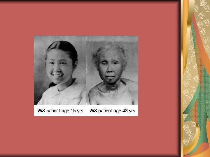 Cancer is a disease of the cell cycle Werner Syndrome is an other genetic disorder associated with premature aging. In this case, the disease process begins between the ages of 15 and 20 years, and affected individuals die of age-related problems by 45 t 0 50 years. It is characterised by: premature greying an thinning of the hair, short stature, prematurely aged appearance, osteoporosis, diabetes mellitus type 2, hypogonadism, premature atherosclerosis, a weak or hoarse voice, and cataracts.