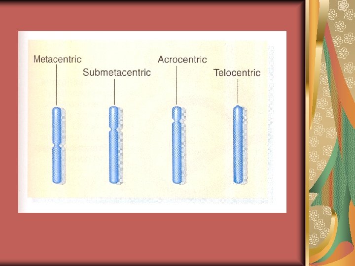 Chromosome The chromosomes are distinguishable on the basis of their size, centromere position, and banding pattern. The centromere may be in the middle, off-center, or close to one end- metacentric (1, 3, 19, 20), submetacentric, and acrocentric, respectively. Acrocentric chromosomes have one arm with a stalk and often with a ‘’bulb’’ (called a satellite) on it ; 13, 14, 15, 21, 22 (repeated bp of r. RNA genes). Telocentric chromosomes have only one arm, because the centromere is at the end.
