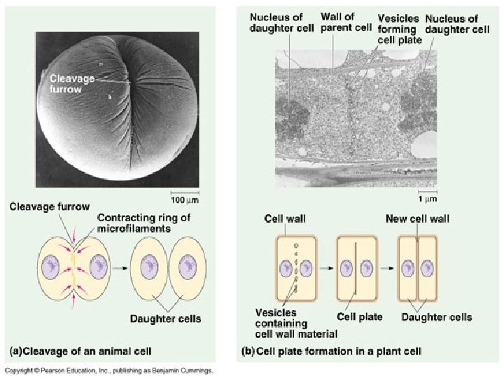 Telophase: The newly divided animal cell pinches itself off in the middle; a plant cell forms a cell plate.