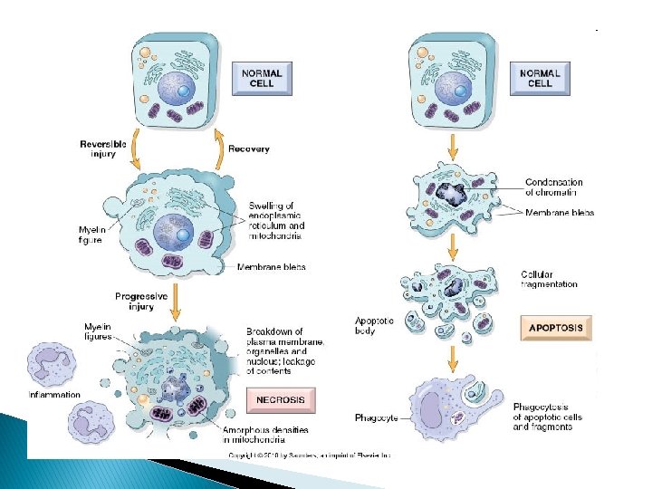 Hallmarks of irreversible injury (Necrosis) � Profound disturbances in membrane function � Profound mitochondrial injury � Increased cytoplasmic eosinophilia. � Marked dilatation of ER , mitochondria. � Mitochondrial densities. � More myelin figures. � Nuclear changes(karyolysis, pyknosis, karyorrhexis)