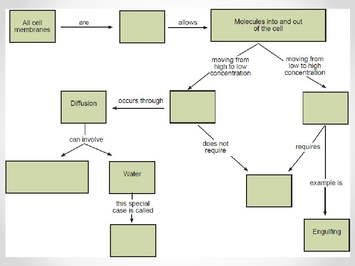 Osmosis • Movement of water molecules from high to low concentration • Isotonic solution- same concentration of dissolved particles as cell • Hypertonic solution- has a higher concentration of dissolved particles than cell; cell shrivels • Hypotonic solution- lower concentration of dissolved particles than cell; cell expands and bursts