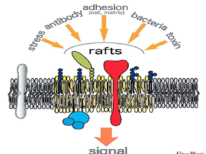 Lipids Rafts • Rafts areas of the exoplasmic leaflets of lipid Bilayer enriched in cholesterol and sphingolipid. They are involved in signal transduction • The rafts are made by the clustering of sphingolipid with cholesterol in the outer monolayer of the plasma membrane. The rafts are less fluid and are thicker than their neighboring phospholipids rich region. • The rafts appear to have receptors and signaling protein.