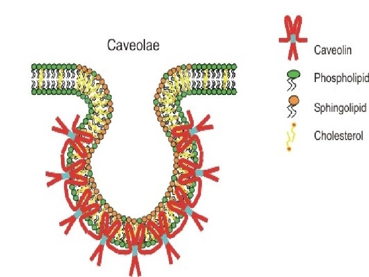 CAVEOLAE • Caveolae are formed by curving inward of the inner leaflets of plasma membrane and integral protein namely caveolin. Forces the formation of caveoli. Which are probably involved in membrane transformed rigidity.