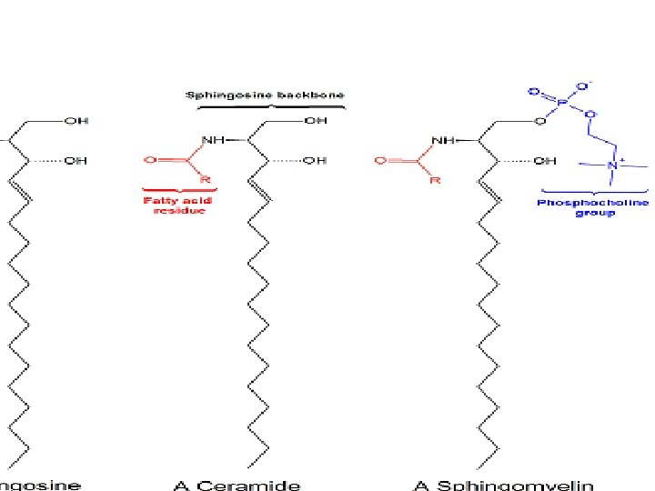 Major lipids in cell membrane 1 - PHOSPHOLIPIDS • 1. Phosphoglycerides. glycerol backbone to which are attached two fatty acids in ester linkage and phosphorylated alcohol fatty acids having even no 16 to 18 C can be saturated or unsaturated. simplest is phosphatidic acid others are Phosphatidyl choline , ethnolamine, serine, glycerol or inositol • 2. sphingomyline Sphingocine backbone. a fatty acid attached by an amide linkage to the amino group of Sphingocine forming ceramide. The OH of Sphingocine is linked with phosphocholine e. g. Sphingomyline in myelin sheath.
