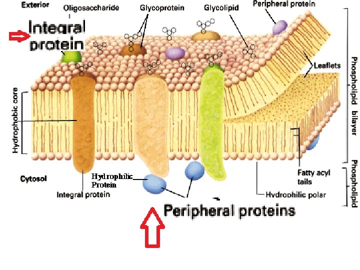 • Proteins are embedded in this bilayer sheet, held by hydrophobic interactions between membrane lipids and hydrophobic domains in the proteins. Some proteins protrude from only one side of membrane; others have domains exposed on both sides • The orientation of proteins in bilayer is asymmetric, giving membrane “sidedness”: protein domains exposed on one side of bilayer are different from those exposed on other side, reflecting functional asymmetry.
