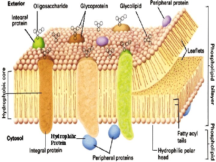 Membrane proteins • Protein can be amphipatic and form an integral part of the membrane by having hydrophilic regions protruding at the inside and outside faces of the membrane but connected by a hydrophobic region traversing the hydrophobic core of Bilayer. An other aspect of the interaction of lipids and protein is that some proteins are anchored to one leaflet or another of Bilayer by covalent linkage to certain lipids.