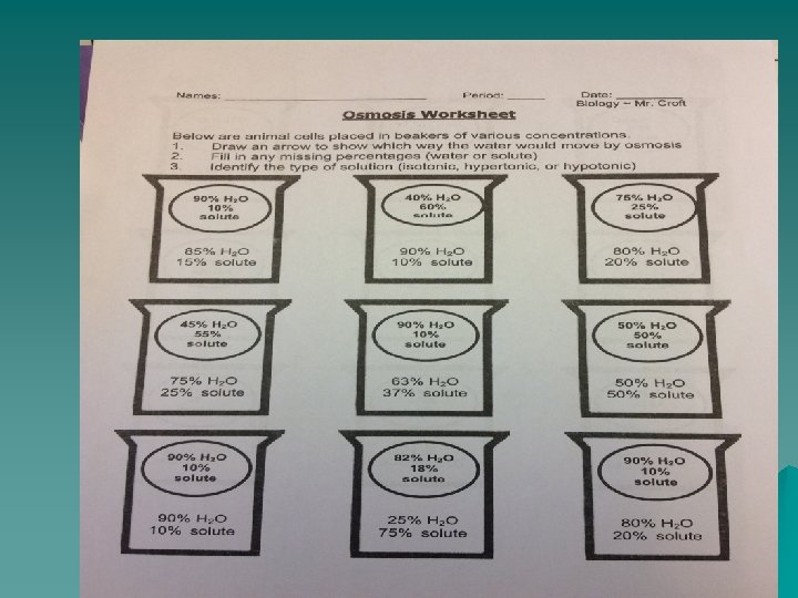Water concentrations Solute- The substance that is dissolved in the water (salt, sugar) u Solution- The combination of water and dissolved substance (ocean water) u Types of solution: u – Isotonic- same concentration as the cell – Hypotonic- less solute than the cell – Hypertonic- more solute than the cell