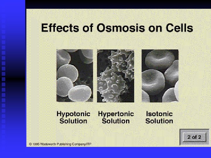 Hypertonic solution n n Solute concentration of solution higher than cell More dissolved particles outside of cell than inside of cell Higher water concentration inside cell Water moves out of cell