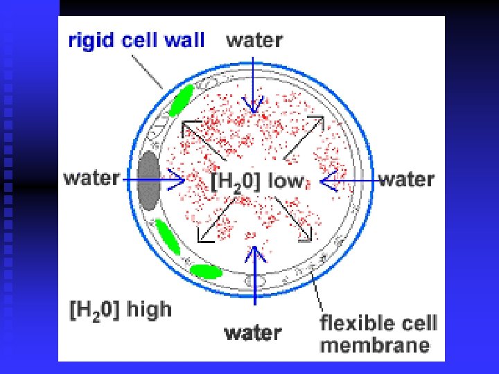 Hypotonic solution n n Solute concentration of solution lower than cell Less dissolved particles outside of cell than inside of cell Hypo = less, under (think hypodermic, hypothermia); Tonic = dissolved particles Water moves into cell from solution Cell expands (and may burst)
