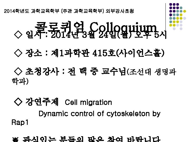 Cell migration : Dynamic control of cytoskeleton by Rap 1 Taeck Joong Jeon Chosun University, Department of Life Science, Gwangju Cell migration is involved in many biological and pathological processes, including embryonic development, wound healing, inflammatory responses, and tumor cell invasion and metastasis. Although there is considerable interest in elucidating the fundamental mechanisms underlying cell migration, understanding cell migration is challenging because it requires the integration and temporal coordination of many different processes that occur in spatially distinct locations within the cell. Cell movement involves a coordinated regulation of the cytoskeleton, F-actin-mediated protrusions at the front and myosin-mediated contraction of the posterior of a cell. The small GTPase Rap 1 functions as a key regulator in the spatial and temporal control of cytoskeleton reorganization for cell migration. In this seminar, I will outline the establishment of cell polarity by differential localizations of the cytoskeleton and discuss the spatial and temporal regulation of cytoskeleton reorganization via the Rap 1 signaling pathway during chemotaxis with a focus on recent advances in the study of chemotaxis using a simple eukaryotic model organism, Dictyostelium discoideum.