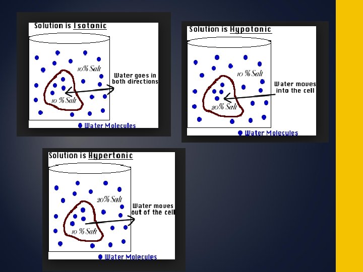 Osmosis • Diffusion of water across a membrane • Moves from HIGH water potential (low solute) to LOW water potential (high solute) Diffusion across a membrane Semipermeable membrane