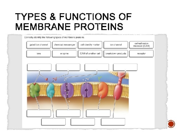 MEMBRANE PROTEINS § Proteins make up the second major chemical component of plasma membranes. § Integral proteins are embedded in the plasma membrane and may span all or part of the membrane. § Integral proteins may serve as channels or pumps to move materials into or out of the cell. § Peripheral proteins are found on the exterior or interior surfaces of membranes, attached either to integral proteins or to phospholipid molecules. § Both integral and peripheral proteins may serve as enzymes, as structural attachments for the fibers of the cytoskeleton, or as part of the cell’s recognition sites.