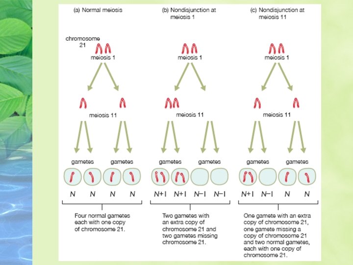 Problems with Meiosis • Meiosis is usually an exact process, but sometimes errors occur. • The resulting chromosomal abnormalities (extra or missing chromosomes) can have severe effects on off-spring. • Non-separation of chromosomes, and fusion of nonhomologous chromosomes can both occur during meiosis and lead to different problems. • The inheritance of too many or too few chromosomes is referred to as aneuploidy, and can occur in autosomes or in sex chromosomes. • About 15% of pregnancies end with a spontaneous abortion. Approximately half of these occur because the zygote has an abnormal number of chromosomes.