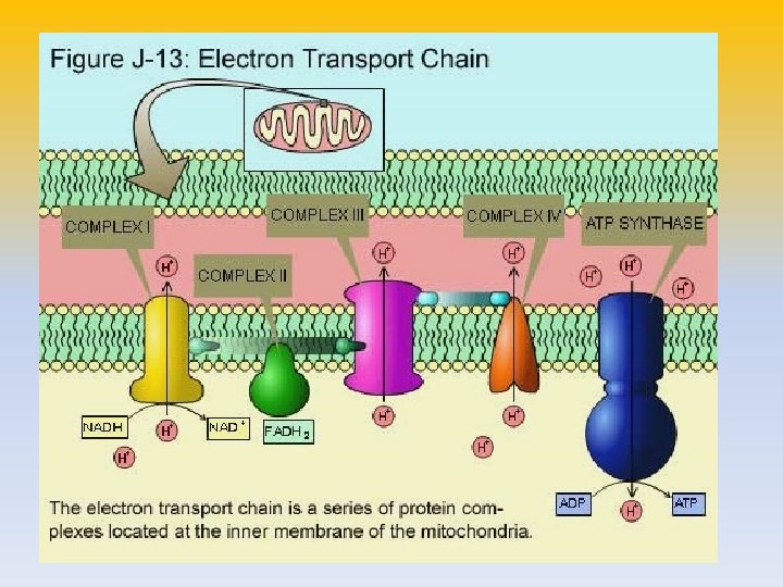 • In the mitochondrial matrix electrons from NADH are transferred to Co Q by NADH DEHYDROGENASE; energy is released • As a result the H+ ions ( protons) are transferred to the inter membrane space.