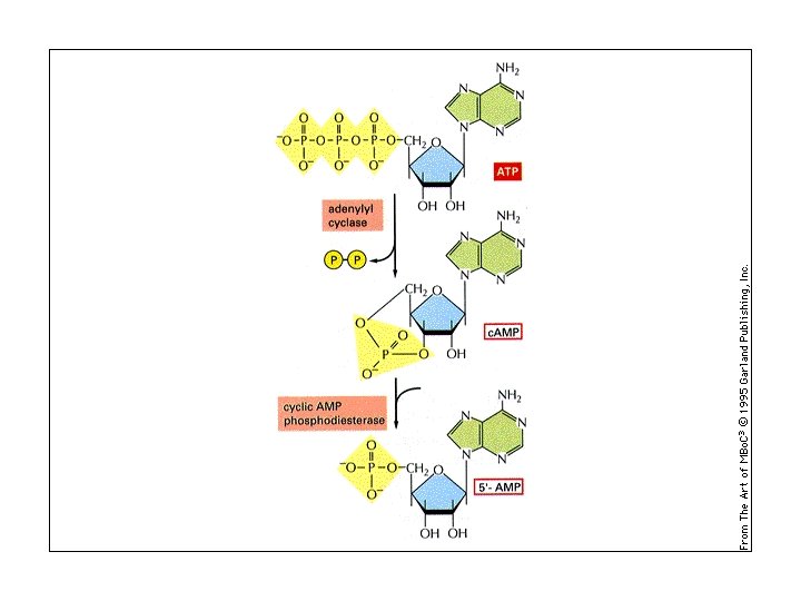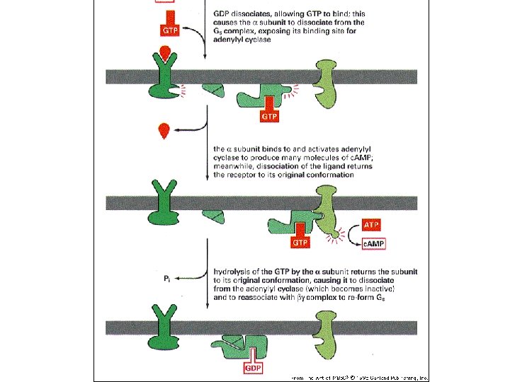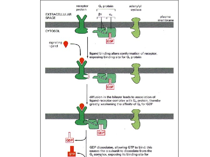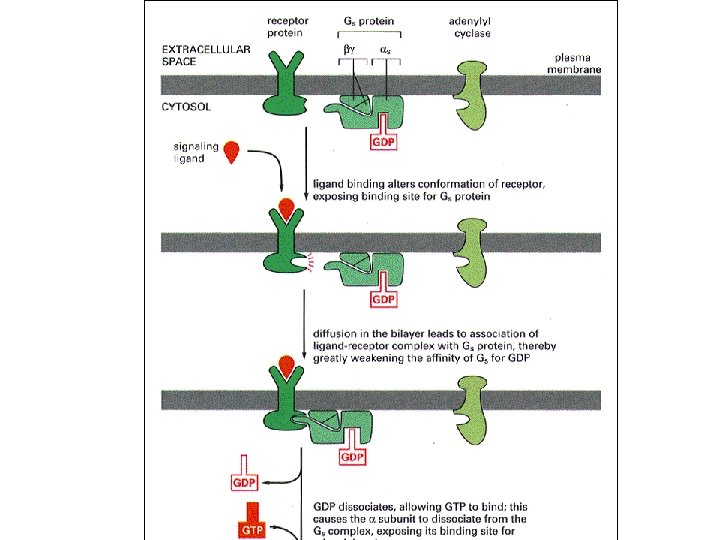 B. G-linked Receptors • Trimeric G-proteins disassemble when activated – Inactive G-protein has a bound GDP – When activated: GDP dissociates, new GTP is bound – This causes a to dissociate from bg – a binds to adenylate cyclase, altering its activity – Gs protein stimulates activates adenylate cyclase, Gi inhibits it