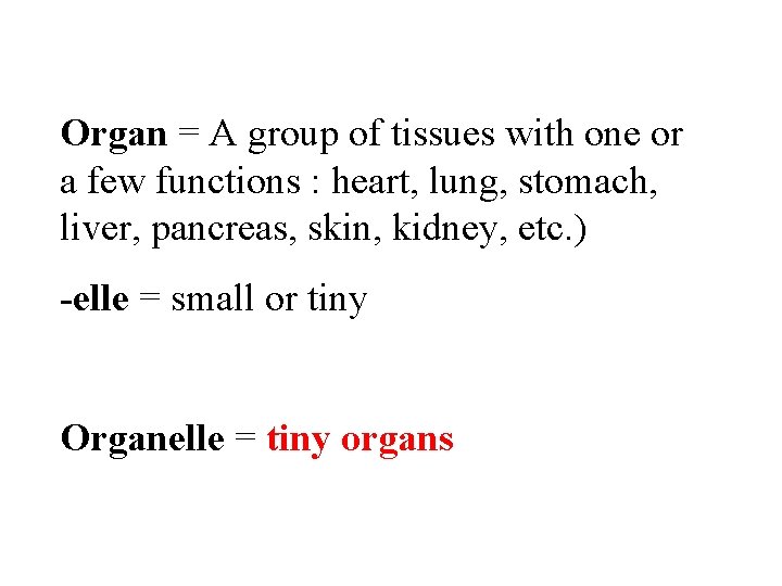 Organ = A group of tissues with one or a few functions : heart, lung, stomach, liver, pancreas, skin, kidney, etc. ) -elle = small or tiny Organelle = tiny organs