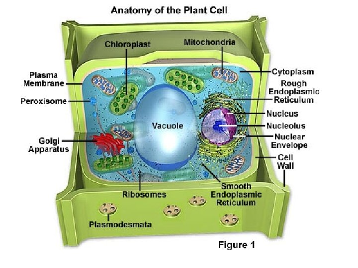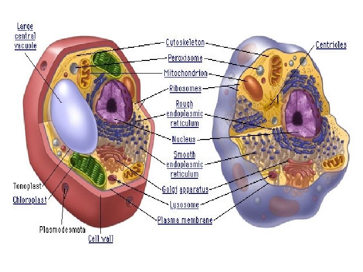 PLANT CELLS • Cell wall – rigid layer that lies outside the cell’s plasma membrane, which contain a carbohydrate called cellulose. • Central vacuole – A large, fluid-filled organelle that stores water, enzymes, metabolic wastes, and other materials. • Chloroplasts – use light energy to make carbohydrates from carbon dioxide and water. Contains chlorophyll ( molecules that absorbs light and captures light energy for the cell)