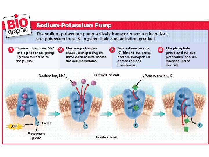 Sodium-Potassium “pump” • Sodium-Potassium pump is powered by the cells ATP • 3 Sodium ions out of the cell and 2 Potassium ions into the cell with each cycle