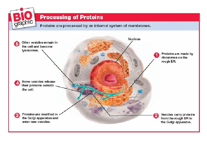 Packaging and Distribution of proteins • Vesicles containing newly made proteins move through cytoplasm from Rough E. R. to Golgi Apparatus • Golgi Apparatus modifies proteins (checks folding, or refolds) • Golgi then repacks proteins in new vesicles and sends them on • Either out of the cell, or to the lysosome (if tagged w/ Manose-6 phosphate)