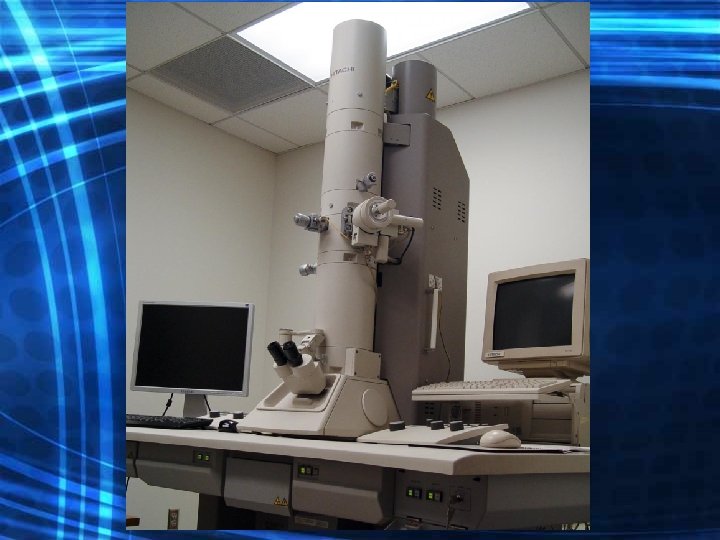 Transmission Electron Microscope (TEM) • Electrons are passed through a specimen to a fluorescent screen. • Thick parts of the specimen absorb more electrons than thin parts, forming a black and white shaded image of the specimen. • Can magnify up to 500, 000 x. • The specimen must be dead, sliced very thin, and stained with heavy metals.