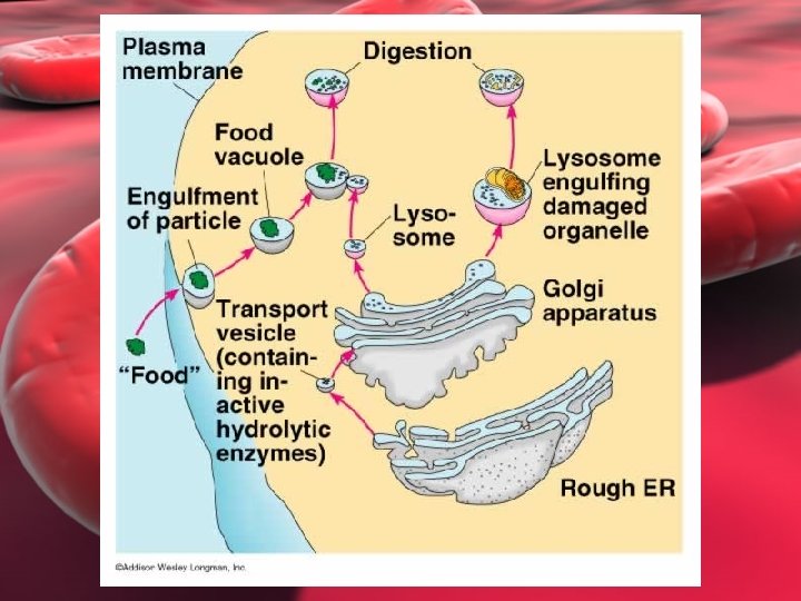 Lysosomes • Structure: Small spherical organelles that enclose hydrolytic enzymes within a single membrane. • Function: Digest molecules, old organelles, and foreign substances (engulfs viruses or bacteria)