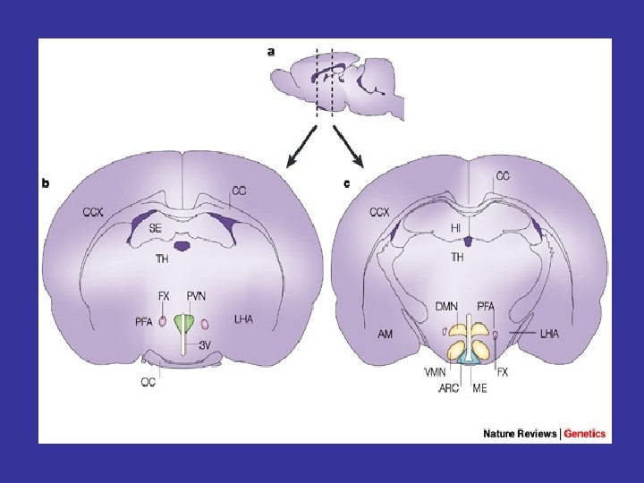 Npy increased by starvation not regulated by overfeeding Pomc / Cart increased by starvation decreased by overfeeding