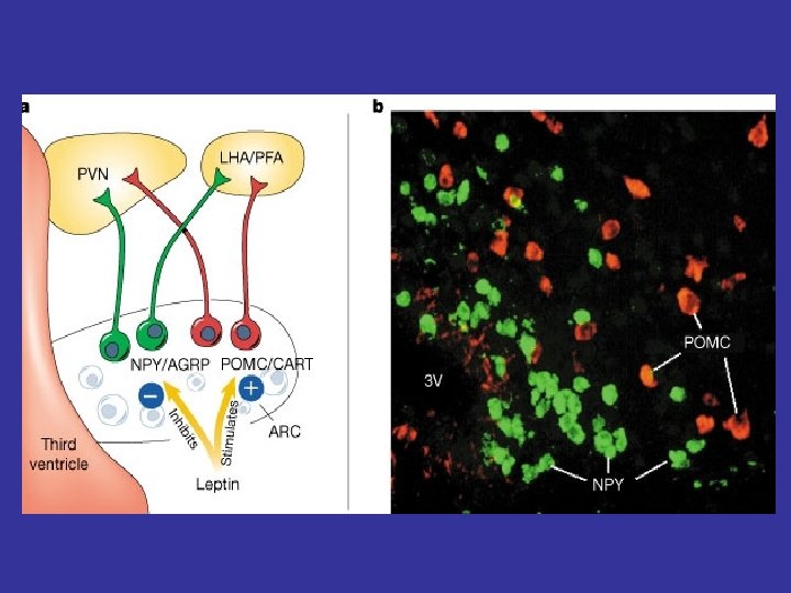 Two classes of neurons involved in responses to leptin in the CNS: -depolarized-> anorexigenic peptides -hyperpolarized->orexigenic peptides