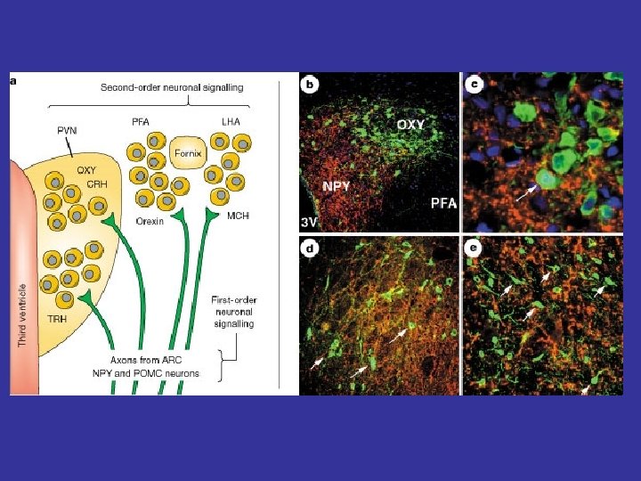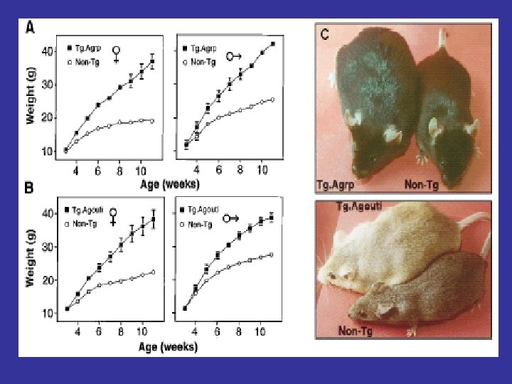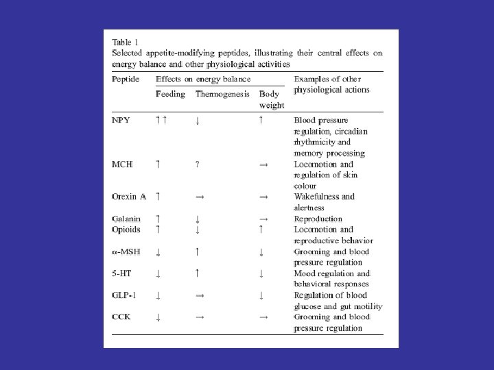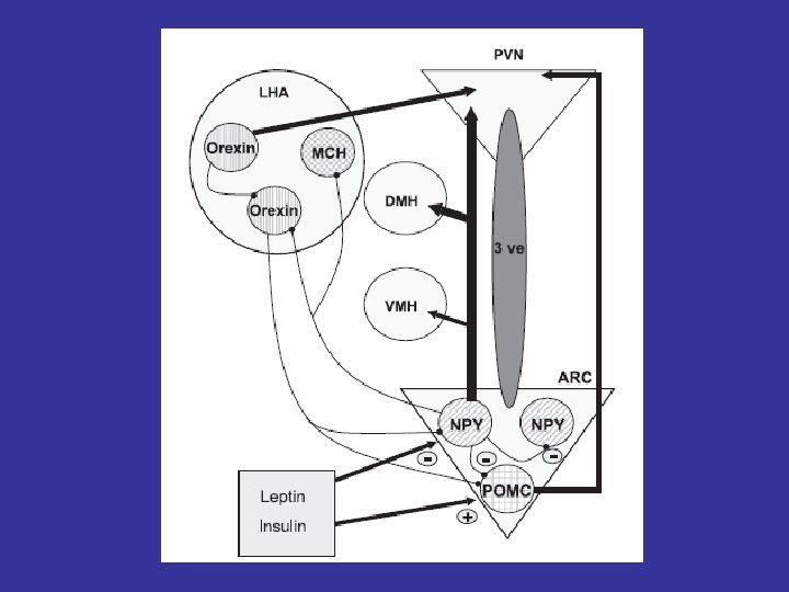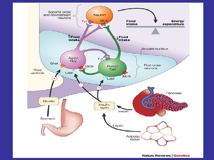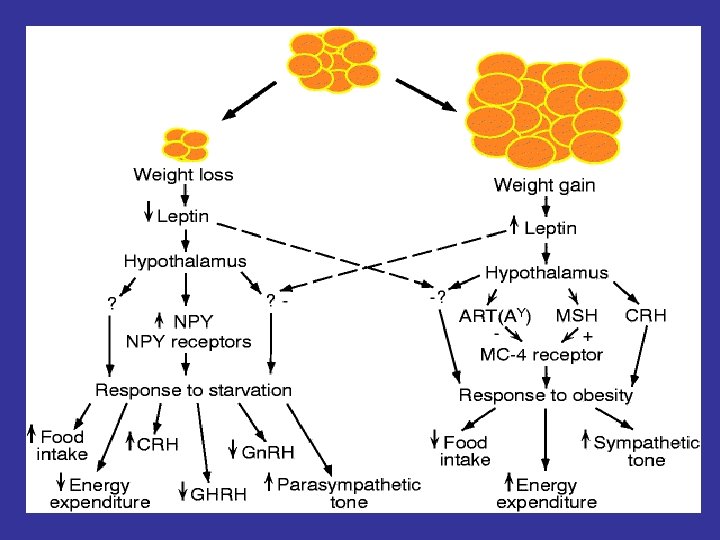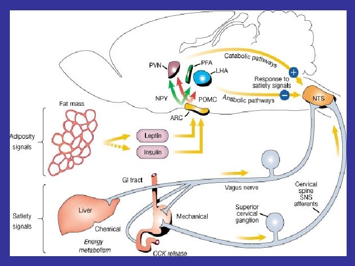 MOLECULAR MEDIATORS OF ENERGY HOMEOSTASIS Neuropeptides * Agouti protein * a-MSH (a-Melanocyte stimulating hormone) * Cocaine- and amphetamine –regulated transcript (Cart) * Hypocretin (or Orexin) 1 and 2 * MCH (melanin-concentrating hormone) * NPY (neuropeptide Y) * TRH (thyrotropin-releasing hormone) Peripheral molecules * Leptin * CCK (cholecystokinin) * Ghrelin * Insulin