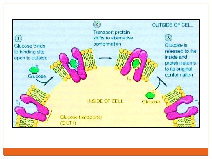 Facilitated Diffusion �The movement of molecules across the membrane is with the assistance of carrier proteins located within the cell membrane. �Facilitated diffusion is the process used for molecules that can’t diffuse rapidly through the cell membrane. This is due to the molecules being too large to pass through.