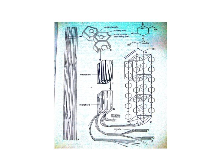 Ultrastructure • The cell wall under electron microscope shows 2 parts • 1. Matrix- non cellulosic part • 2. Fibrils- embedded in matrix and made up of cellulose. • The largest fibril seen by a light microscope is called macro fibril and smaller fibrils under electron microscope are called micro fibrils. • Smaller fibrils visualized as subunits of micro fibrils are called micelles which in turn are further divided to form cellulose molecules.