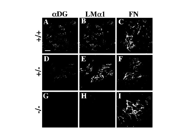 Dystroglycan • Some evidence suggests that dystroglycan is involved in and perhaps necessary for laminin polymerization at the surface of cells, which initiates basement membrane formation. • Dystroglycan KO embryonic stem cells cannot assemble soluble laminin at their cell surfaces. • Dystroglycan KO has no Reichert’s basement membrane, dies at ~E 5 to E 6 (just after implantation into the uterus).