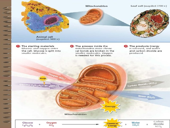 CELLS RELEASE ENERGY • Cellular Respiration = cells using O 2 to release energy stored in sugar (glucose); occurs mostly in the mitochondria • Glucose gets broken down (with O 2) into CO 2 and WATER; the exact opposite of photosynthesis • C 6 H 12 O 6 + 6 O 2 --- 6 H 2 O + 6 CO 2 + energy