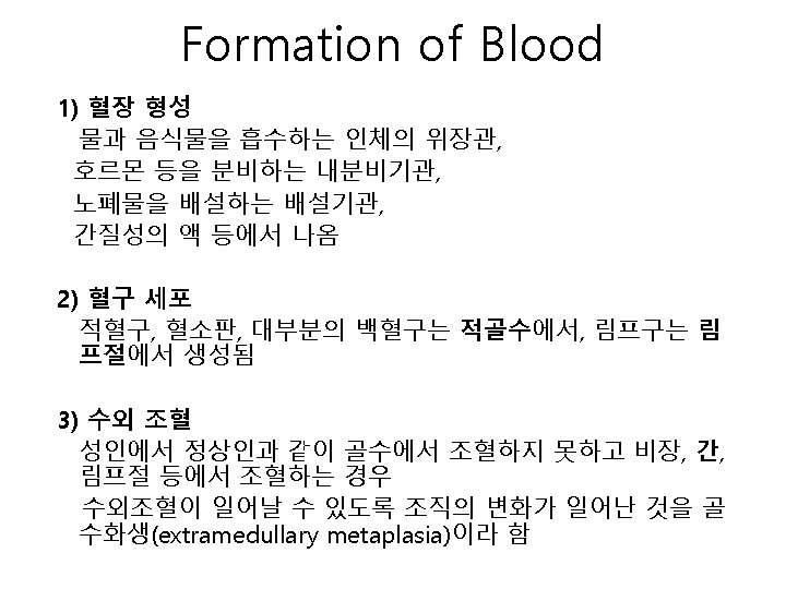 태생기의 조혈 1. 중배엽기(Mesoblastics phase) : • 수정 2~3주(태생 10일경)부터 2개월까지 중배엽의 원시혈관과 난황 낭에서 조혈(primitive erythroblasts, megakaryocytes, granulocytes 생성) • primitive erythroblasts는 초기의 혈색소 합성이 이루어지고 태아 발 달 처음 3개월 동안에 Portland, Gower-1, Gower-2 혈색소 측정 가능 2. 간기(Hepatic phase) : • 임신 4주(태생 2개월)부터 7개월까지 간, 비장에서 조혈(primitive erythroblasts, definitive erythroblasts, megakaryocytes, granulocytes, lymphocytes, monocytes 생성) , 개월 때 절정 • 혈색소 F, A, A 2가 생성 3. 골수기 (Myeloid phase) : • 임신 5개월(태생 4~5개월)부터 골수, 림프절 및 림프조직에서 조혈이 이루어지고, 태아 6개월에는 모든 세포 생성 • Erythropoietin(EPO), G-CSF, GM-CSF, fetal hemoglobin, adult hemglobin이 생성