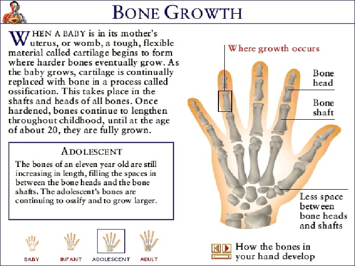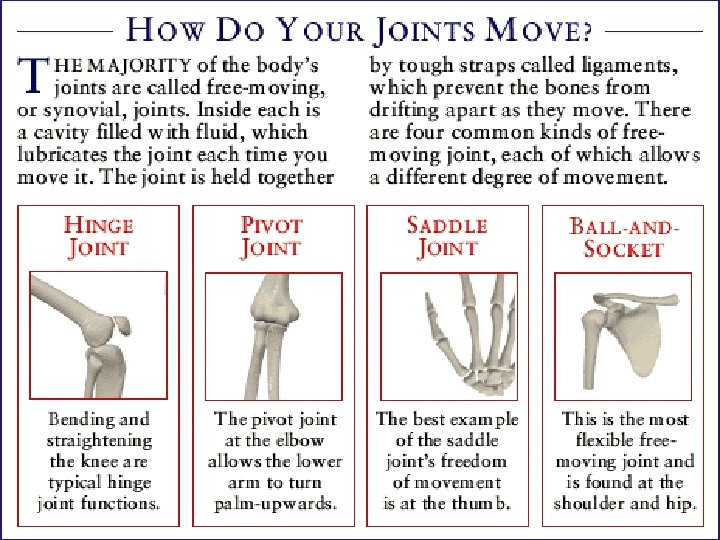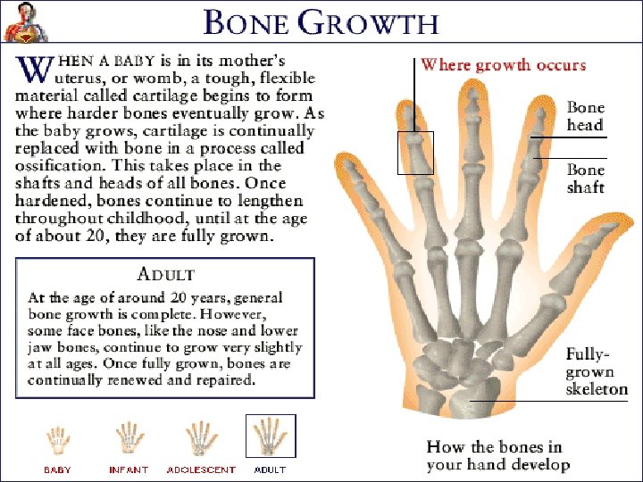 EXERCISE AND BONE TISSUE n Within limits, bone has the ability to alter its strength in response to mechanical stress by increasing deposition of mineral salts and production of collagen fibers. n Removal of mechanical stress leads to weakening of bone through demineralization (loss of bone minerals) and collagen reduction. n reduced activity while in a cast n astronauts in weightless environment n bedridden person n Weight-bearing activities, such as walking or moderate weightlifting, help build and retain bone mass.